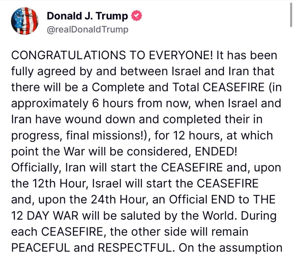 트럼프 대통령 트루스 소셜 번역 모두에게 축하의 말을 전합니다! 이스라엘과 이란 간에 완전하고 전면적인 휴전이 체결되었음을 공식적으로 알립니다. (약 6시간